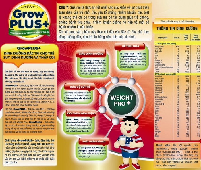 Chất lượng sữa Grow Plus+ được đảm bảo bởi Hệ thống Quản Lý Chất Lượng ABS-QE Hoa Kỳ, hoàn toàn không chứa bất kỳ chất kích thích tăng trưởng gây hại nào. Đặc biệt, với công thức Weight Pro 5+ gồm 5 tổ hợp chất thiết yếu hỗ trợ tối đa giúp trẻ thoát khỏi tình trạng suy dinh dưỡng, phát triển toàn diện cả về thể chất lẫn trí não