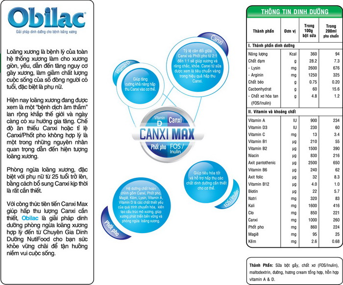 Sữa bột Obilac giàu canxi được nghiên cứu và phát triển bởi các chuyên gia dinh dưỡng hàng đầu, với công thức có hàm lượng canxi tối ưu. Canxi có vai trò quan trọng giúp xương, răng vững chắc và phòng ngừa loãng xương hiệu quả.