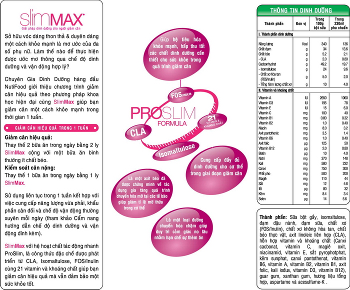 SlimMax với hệ hoạt chất tác động nhanh ProSlim là công thức tối ưu được phát triển từ CLA, Isomaltulose, FOS cùng 21 vitamin và khoáng chất giúp bạn giảm cân hiệu quả mà vẫn đảm bảo một sức khỏe tốt.