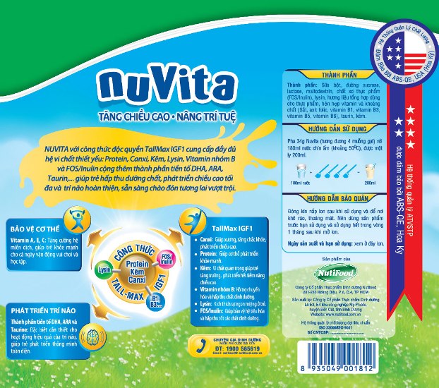 NUVITA mới với công thức độc quyền TallMax - IGF1 cung cấp đầy đủ hệ vi chất thiết yếu: Protein, Canxi, Kẽm, Lysin, Vitamin nhóm B và FOS/Inulin cộng thêm thành phần tiền tố DHA, ARA, Taurin,… giúp trẻ hấp thu dưỡng chất, phát triển chiều cao tối đa và trí não hoàn thiện, sẵn sàng chào đón tương lai vượt trội.